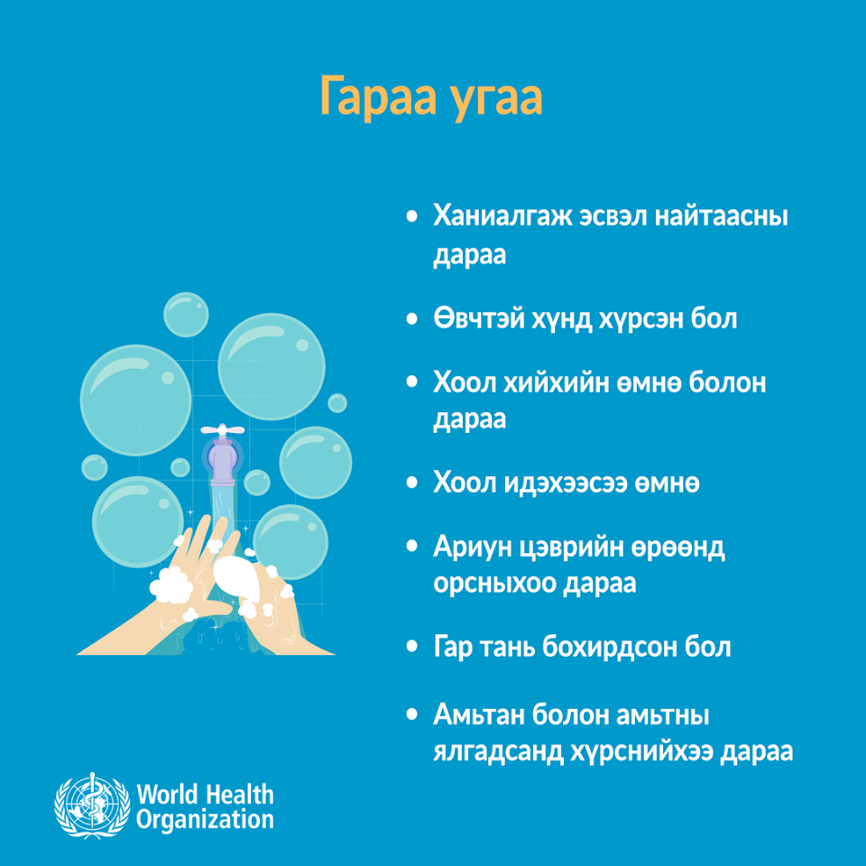 Коронавирусний халдварын анхны тохиолдол Монгол Улсад бүртгэгдсэн энэ үед иргэн бүр эрүүл мэндийн байгууллагаас өгч буй зөвлөмжийг сахих  хэрэгтэй юм. Дэлхийн эрүүл мэндийн байгууллагаас өгсөн зөвлөмжийг эргэн сануулъя.