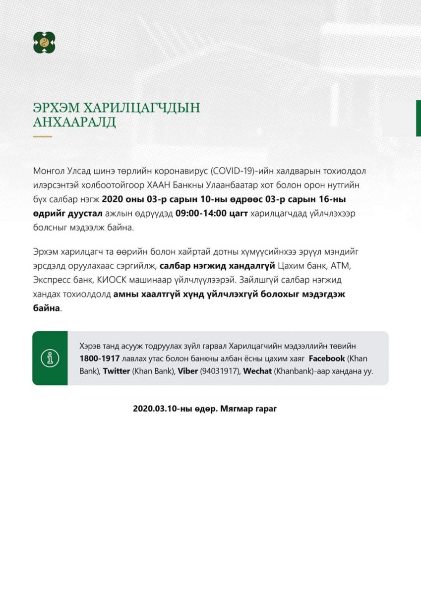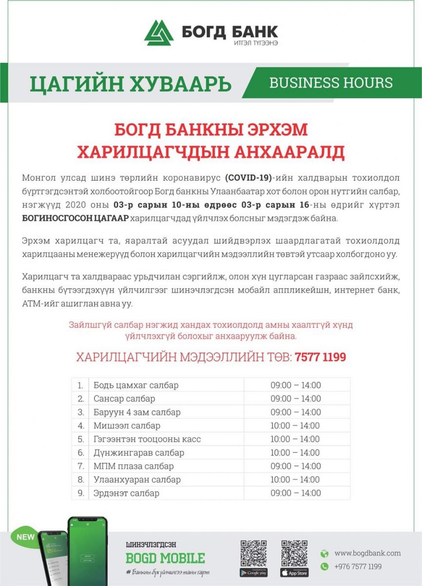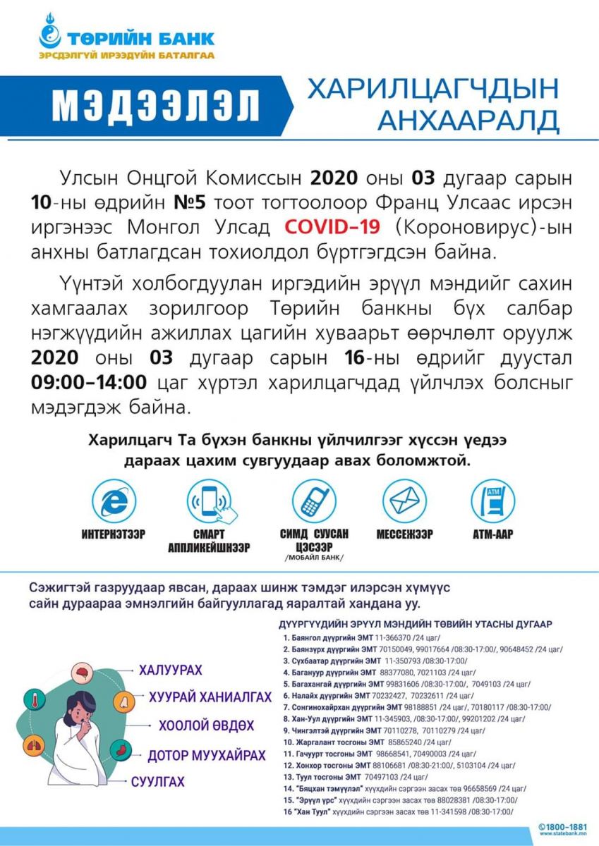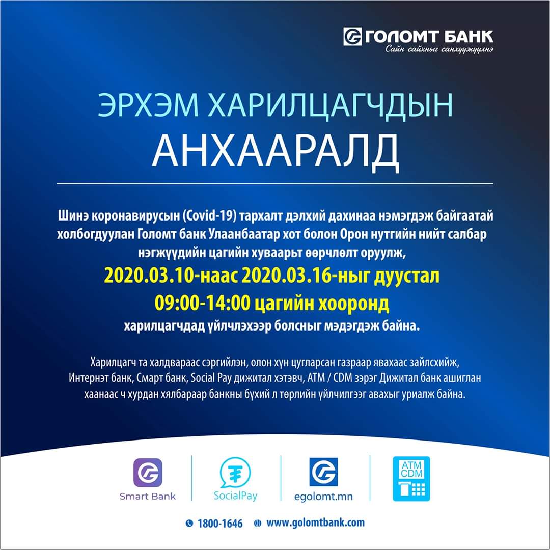 Монгол улсад коронавирусний анхны тохиолдол бүртгэгдлээ. Үүнтэй холбогдуулан банкууд цагийн хуваарьтаа дараах өөрчлөлтийг оруулжээ.