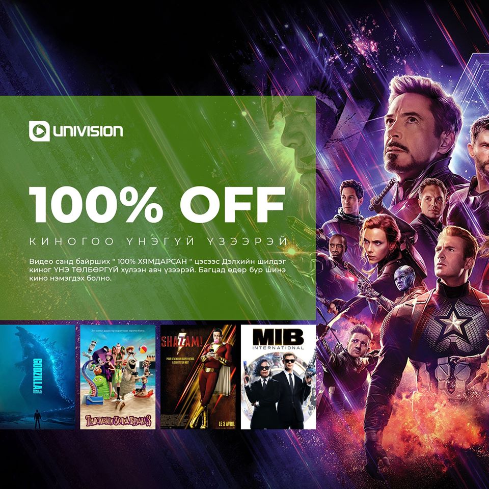 COVID-19 халдварт өвчний тархалт болон үүсээд буй онцгой нөхцөл байдалтай холбогдуулан IPTV үйлчилгээ үзүүлэгч Юнивишн компани Видео сандаа дэлхийн шилдэг кинонуудыг багтаасан “100% OFF” цэс нэмлээ.