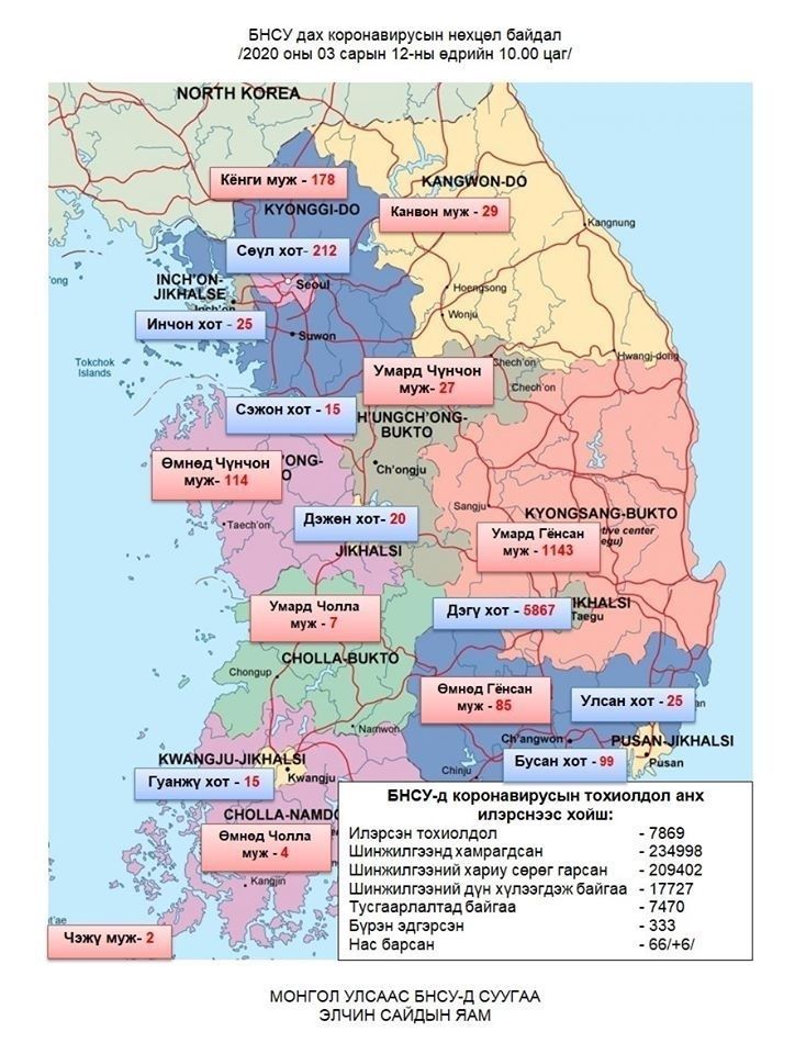 - Улсын Онцгой Комиссын шийдвэрийн дагуу гадаад улсын иргэдийг 3 дугаар сарын 30-ны өдрийг дуустал Монгол Улсын хилээр нэвтрүүлэхийг хориглосон тул зөвхөн БНСУ-д богино хугацааны визтэй байгаа, хүндэтгэн үзэх шалтгаантай Монгол Улсын иргэдийг бүртгэнэ.