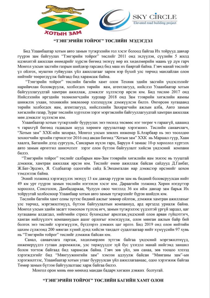 Улаанбаатар хотын авто замын түгжрэлийн гол хэсэг болсон Их тойрууд давхар гүүрэн зам байгуулах "Тэнгэрийн тойрог" төслийн багаас мэдэгдэл гаргажээ.