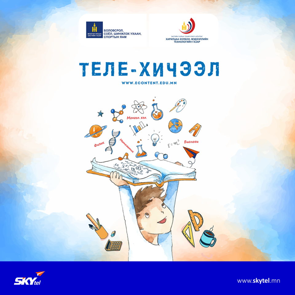 Скайтелийн дугаараас 123 тусгай дугаарт “hicheel” гэж илгээн нэмэлт дата багцаа идэвхжүүлээд гуравдугаар сарыг дуустал теле хичээлээ цагийн хязгаарлалтгүй, үнэ төлбөргүй www.econtent.edu.mn сайт руу хандан үзээрэй.