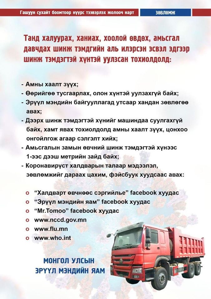 Эрүүл мэндийн яамнаас Гашуунсухайт боомтоор нүүрс тээвэрлэгч жолооч нарт хандан дараах зөвлөмжийг гаргаад байна.