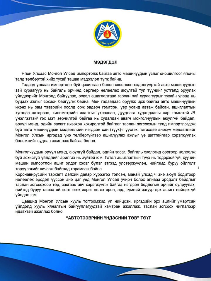 Автотээврийн Үндэсний Төвөөс мэдэгдэл гаргасан байна. Мэдэгдэлд Япон Улсаас Монгол Улсад импортолж байгаа автомашинуудын үзлэг оношилгоог японы талд төлбөртэй хийнэ гэдэг мэдээлэл ташаа болохыг онцолжээ.