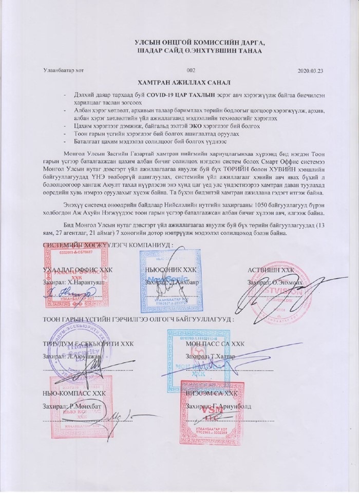 ДЭМБ-аас зарласан цар тахал Ковид-19 халдварын тархалт цаг хором бүрээр нэмэгдэж байна. Энэ цаг үед эмч мэргэжилтнүүд аль болох амьд харилцааг хязгаарлаж, ажлаа цахимаар явуулах зөвлөмжийг өгч байгаа. Тиймээс Монголын мэдээлэл технологийн компаниуд нэгдэж Монгол улсад үйл ажиллагаа явуулж байгаа бүх төр болон хувийн хэвшлийн байгууллага хоорондын албан бичгийн харилцааг цахимжуулах саналыг Улсын онцгой комисст хүргүүлжээ.