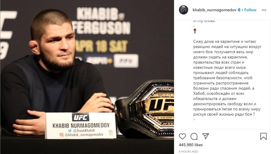 Хабиб Нурмагомедов өчигдөр инстаграм хуудсандаа “Гэртээ карантинд суугаад хүмүүс миний тухай юу бичиж байгааг уншиж сууна. Дэлхий тэр чигээрээ карантинд орж, бүх улсын Засгийн газар, алдартнууд халдвар тараахгүйн тулд аюулгүй байдлаа сахихыг уриалж байна. Харин Хабиб би ямар ч үүрэг хариуцлага байхгүй, дэлхий тойрон нисэж, эрүүл мэнд, амь насаа эрсдэлд оруулах хэрэг үү? Тулаан явагдахгүй болсонд би та нараас илүү харамсаж байна. Тулааны дараа надад хийх маш олон ажлын төлөвлөгөө байсан ч би байдлыг хянаж чадахгүй шүү дээ. Өдөр бүр л байдал өөрчлөгдөж байна. Харин Хабиб юу ч болж байсан тулалдах ёстой гэж үү? Хүмүүс ээ, өөрсдийгөө миний оронд тавиад үз дээ” гэж бичсэн байна.