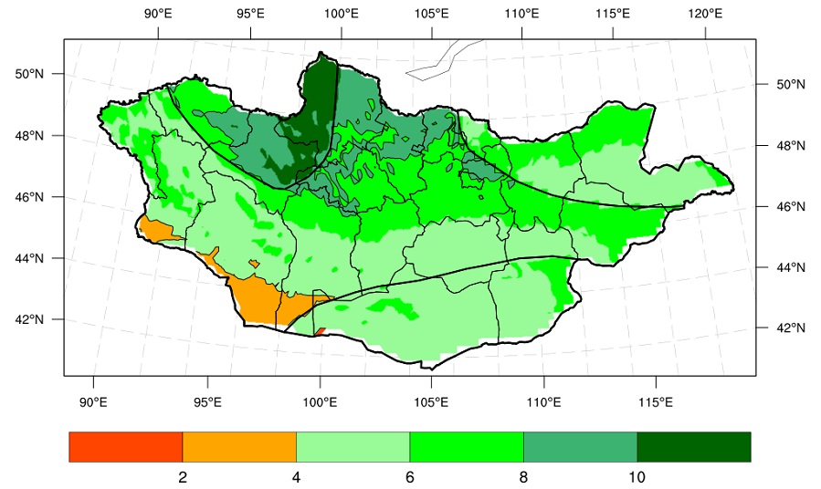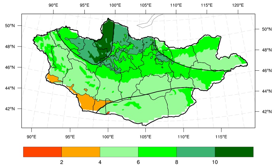 Энэ сард орох хур тунадас нь Хэнтий аймгийн хойд болон Дорнод аймгийн ихэнх нутгаар олон жилийн дунджаас бага, бусад нутгаар дунджийн орчим байх төлөвтэй.