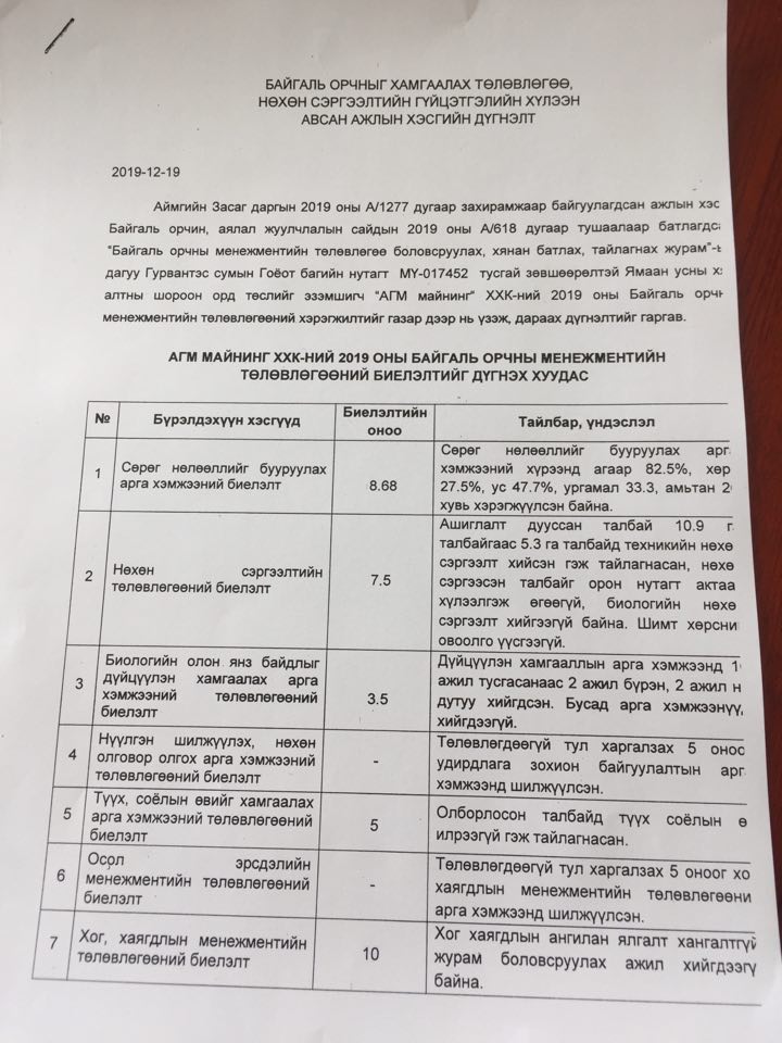 Гурвантэс сумын Гоёот багийн нутагт алтны шороон ордны үйл ажиллагаа явуулдаг "АГМ Майнинг" ХХК-ийн 2019 оны байгаль орчны менежментийн төлөвлөгөөний хэрэгжилтийг шалгахад хэрэгжүүлсэн ажил гэх зүйл алга. Үйл ажиллагааг нь цуцалсан ААН-үүдээс "Баатарван транс", "Өмнийн говийн баялаг", "Сауд гоби коэл транс" гэсэн гурван компани нөхөн сэргээлтийг бүр огт хийгээгүй байх жишээтэй. "АГМ Майнинг" гэхэд лицензийн талбайгаа хэтрүүлж, олборлолт хийсэн төдийгүй лицензийн талбайд байгаа малчдыг газраа чөлөөлөхийг шаардаж, шүүхэд нэхэмжлэл гаргажээ.