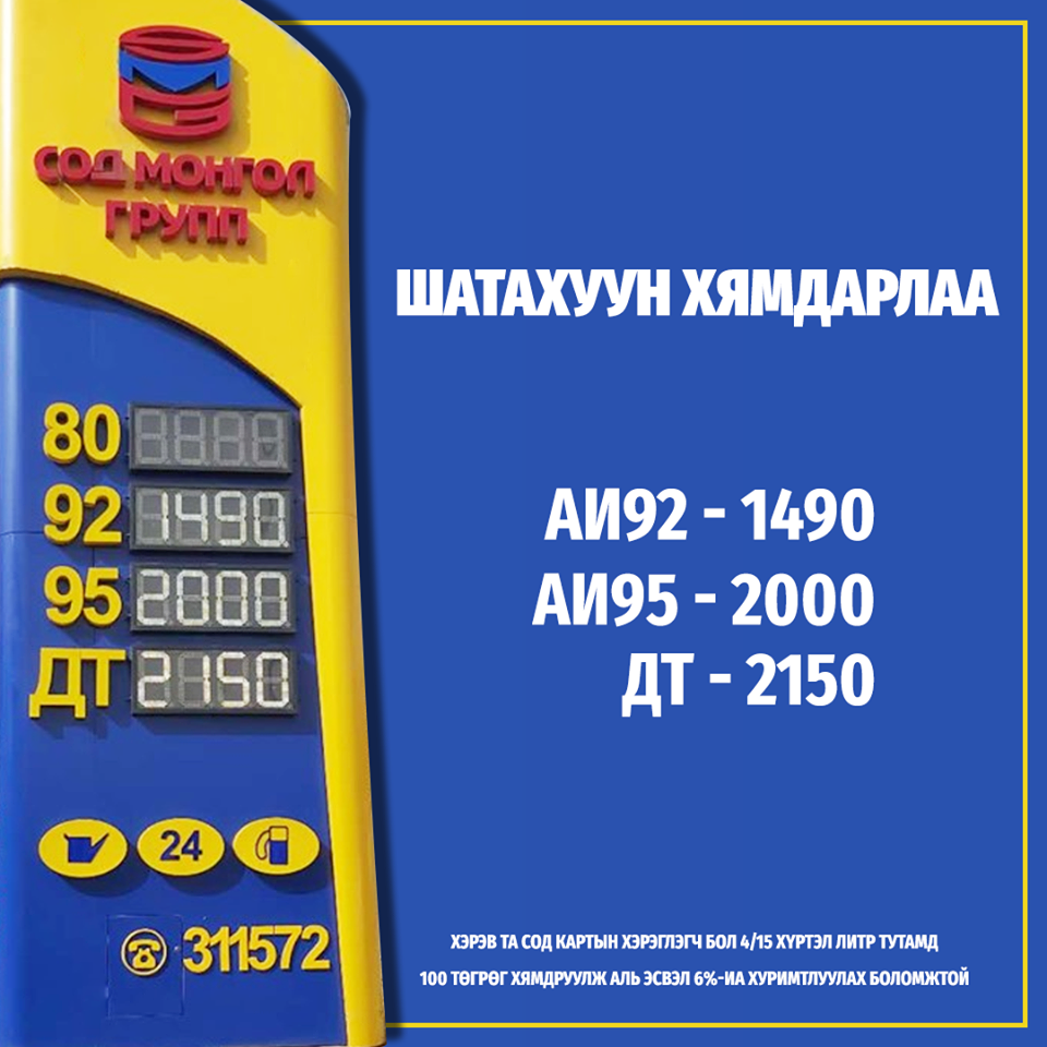 Тухайлбал, "Сод монгол" групп өнөөдрөөс АИ92 бензинийг 1490 төгрөг, АИ95 бензинийг 2000 төгрөг, дизель түлшийг 2150 төгрөг болгон хямдруулжээ. Тус компанийн зүгээс "Өнөөдөр төвийн бүсэд хямдарч байна. Маргааш дахин үнэ буурна" гэж албан ёсны фэйсбүүк хуудаснаа мэдээлжээ.
