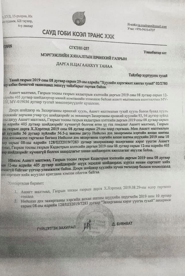 Тэгвэл хоёр тусгай зөвшөөрлөө цуцлуулсан "Сауд Гоби Коэл транс" компани Засгийн газрын шийдвэрийг үл огоорч, шүүхэд хандаад байгаа билээ. Өөрөөр хэлбэл, тэд өнгөрсөн оны аравдугаар сард Засгийн газраас гаргасан шийдвэрийг эс зөвшөөрч Нийслэлийн Захиргааны хэргийн анхан шатны шүүхэд гомдол гаргасан байна. Ингэхдээ шүүхийн шийдвэр эцэслэн гартал ямар ч нөхөн сэргээлтийг хийх боломжгүй гэдгээ мэдэгдсэн байх юм.