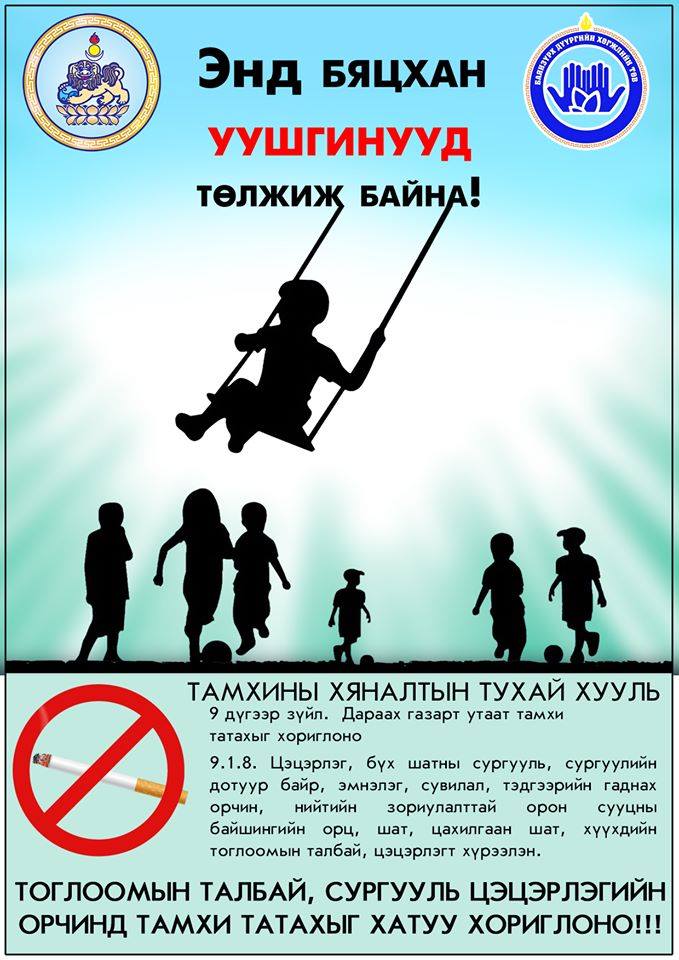 Нийслэлийн Баянзүрх дүүргийн Худалдаа үйлчилгээг зохицуулах зөвлөлөөс дүүргийн Хөгжлийн төвтэй хамтран хүүхдийг эрүүл аюулгүй орчинд амьдрах нөхцөлөөр хангах, цэцэрлэг, сургууль, нийтийн зориулалттай орон сууцны байшингийн орц, шат, цахилгаан шат, хүүхдийн тоглоомын талбай болон цэцэрлэгт хүрээлэнд тамхи татахгүй байхыг уриалж “Энд бяцхан уушгинууд төлжиж байна” сурталчилгааны материалыг хэвлүүллээ.