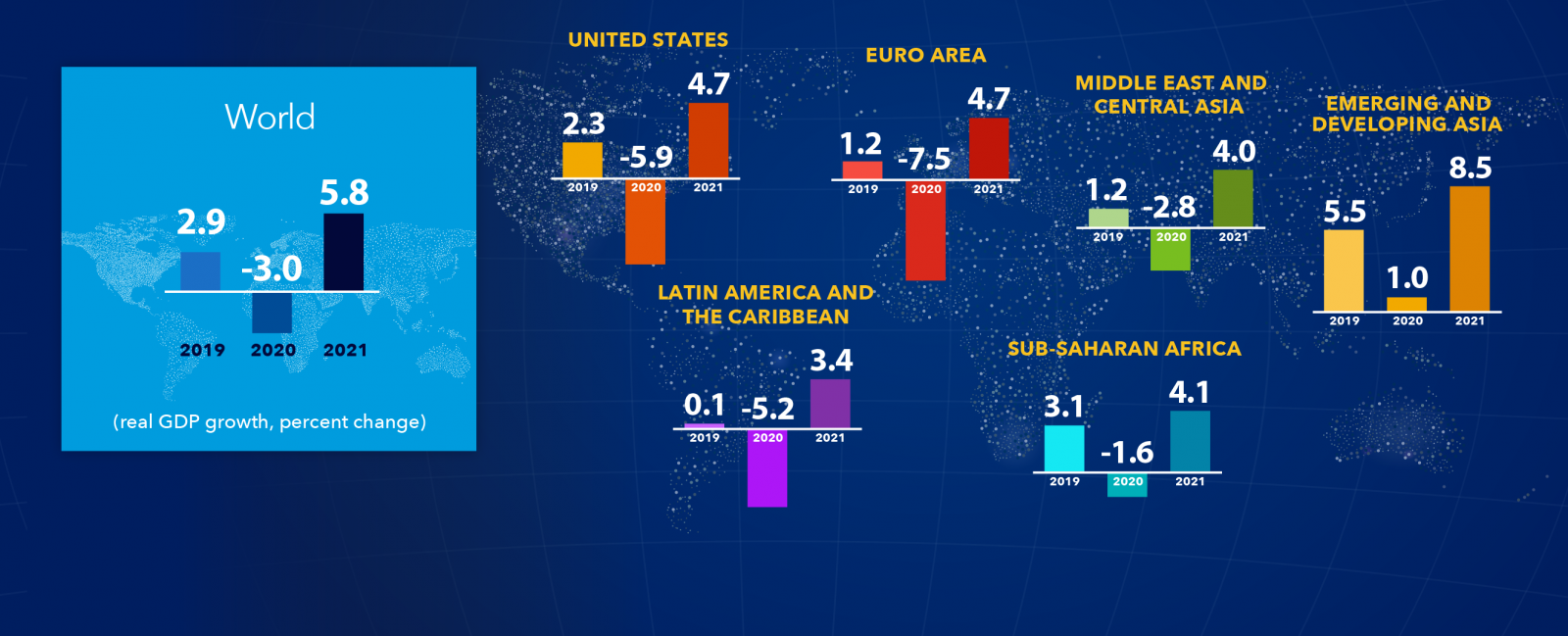 Тэгвэл эдийн засгийн төлөвийн шинэчилсэн тоймд цар тахлын улмаас 2020 онд дэлхийн эдийн засаг гурван хувиар агшина, улс орнууд нийтээрээ энэ оны хоёрдугаар хагаст цар тахлыг хяналтад авч чадвал 2021 онд дэлхийн ДНБ 5.8 хувийн өсөлтөд хүрнэ гэж таамаглажээ.