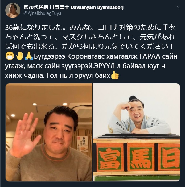 Мэргэжлийн сүмо бөхийн 70 дахь ёкозүна Харүмафүжи энэ сарын 14-нд 36 нас хүрлээ. Харүмафүжи твиттер хуудсаараа дамжуулан, төрсөн өдрөөрөө коронавирусний аюулаас сэргийлэхийг монгол, япон хэлээр уриалсан байна.