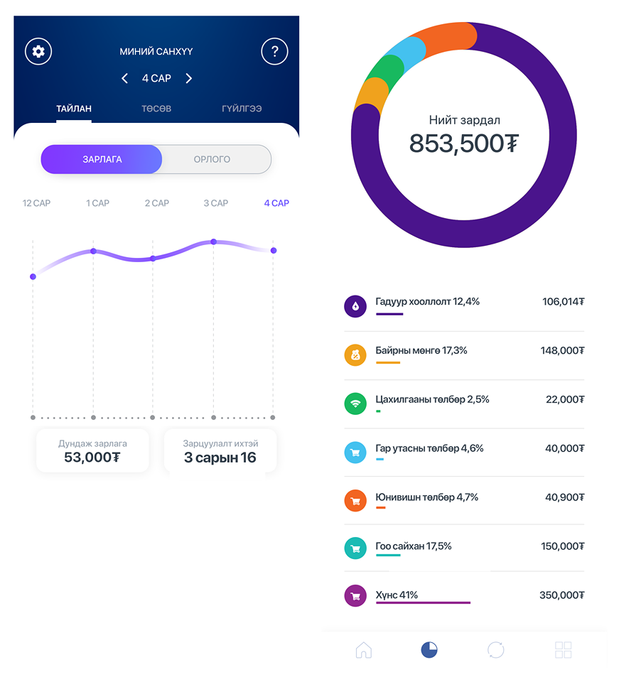 1.  “Миний санхүү” цэс рүү ороход таны сар бүрийн орлого, зарлага, юунд хичнээн төгрөгийг зарцуулсан зэрэг бүхий л санхүүгийн мэдээллийг ангилж харуулаад зогсохгүй өнгөрсөн сарынхаас зарцуулалт хэдэн хувиар өссөн, буурснаа мэдэж, хэрэггүй зарцуулалтаа танаж, мөнгөө хэрэгтэй зүйлдээ хадгалж, ирээдүйд хүссэн зүйлдээ зарцуулах боломжтой болно. Жишээ нь би өнгөрсөн сард гадуур хооллоход 149,000₮, таксинд 35,000₮, нийт 184,000₮ зарцуулжээ. Тиймээс энэ сард гэртээ хоолоо хийн ажилдаа авч явж, дулаарч байгаа учраас ажил гэрийн хооронд алхаж байхаар шийдлээ. Ингэснээр би зөвхөн энэ 2 төрлийн зардлыг танаснаар сар бүр 184,000₮ хэмнэж, хуримтлалдаа хийх боломжтой болсон. Амархан байгаа биз?