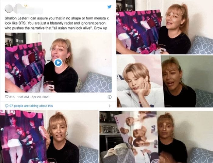Шэллон Лэстер олон нийтийн сүлжээнд оруулсан видео бичлэгтээ BTS хамтлагийн зурагт хуудсыг харуулан “Энэ бол BTS-ийн хатагтай нар. Би эд нарыг үнэхээр ойлгохгүй байна. Энэ залуусыг гэх үү, эмэгтэйчүүдийг юу гэж нэрлэхээ мэдэхгүй байна. Жишээ нь, энэ залуу “Toni & Guy” салоноос гарч ирсэн юм шиг л өнгийн үстэй, бас өнгөтэй линз зүүчихсэн. Чи ази хүн шүү дээ. Хар үстэй, хар нүдтэй азиараа л бай л даа. Цэнхэр нүдтэй бүсгүй болох гэж хичээх шаардлага чамд байхгүй. Зарим нь уруулаа будаж. Би хувьдаа эд нарыг нэг нэгээс нь ялгаж чадахгүй. MONSTA X хамтлаг гэх юм. BTS-ийн гишүүдээс юугаараа ч ялгагдахгүй, яг адилхан царайтай. Өмссөн хувцсыг нь” гэж ярьсан байна.