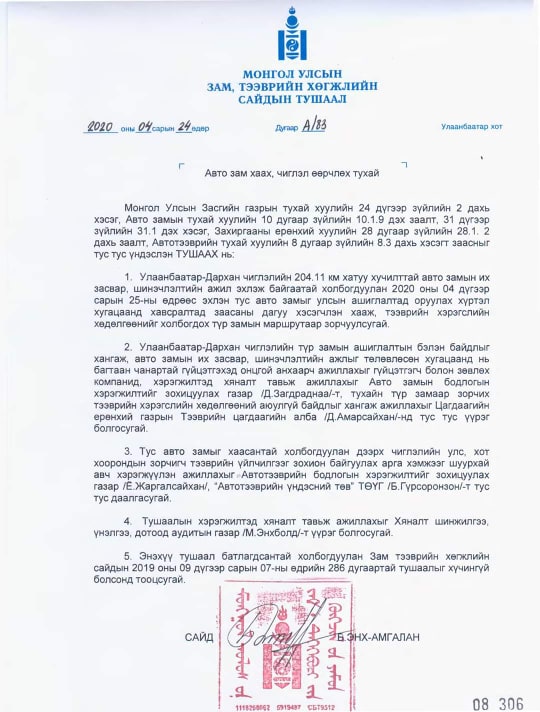 Үүнтэй холбогдуулан Зам, тээврийн хөгжлийн сайдын тушаалаар өнөөдрөөс буюу 2020 оны дөрөвдүгээр сарын 25-ны өдрөөс эхлэн авто замыг хэсэгчлэн хааж, тээврийн хэрэгслийн хөдөлгөөнийг холбогдох түр замын маршрутаар зорчуулахаар зохицуулж байна.