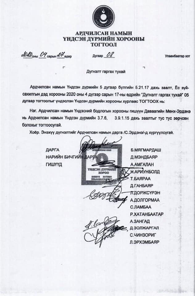 Энэ дагуу М.Чимиддорж, Д.Мөнх-Эрдэнэ нарыг Ардчилсан намын ҮБХ-ны гишүүний сонгуульт албан тушаалаас огцруулах удирдлагын шийдвэр гарсан байна. Уг шийдвэрийн биелэлтэд хяналт тавьж ажиллахыг Ардчилсан намын Ерөнхий нарийн бичгийн дарга Ц.Баатархүүд даалгажээ.