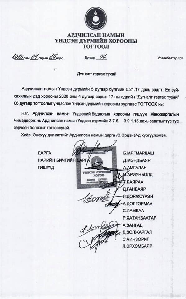 Ардчилсан намын Үндсэн дүрмийн хороо хуралдаж, ҮБХ-ны гишүүн М.Чимиддорж, Д.Мөнх-Эрдэнэ нар Үндсэн дүрмийн 3.7.6, 3.9.1 15 дахь заалтыг тус тус зөрчсөн болохыг тогтоожээ.