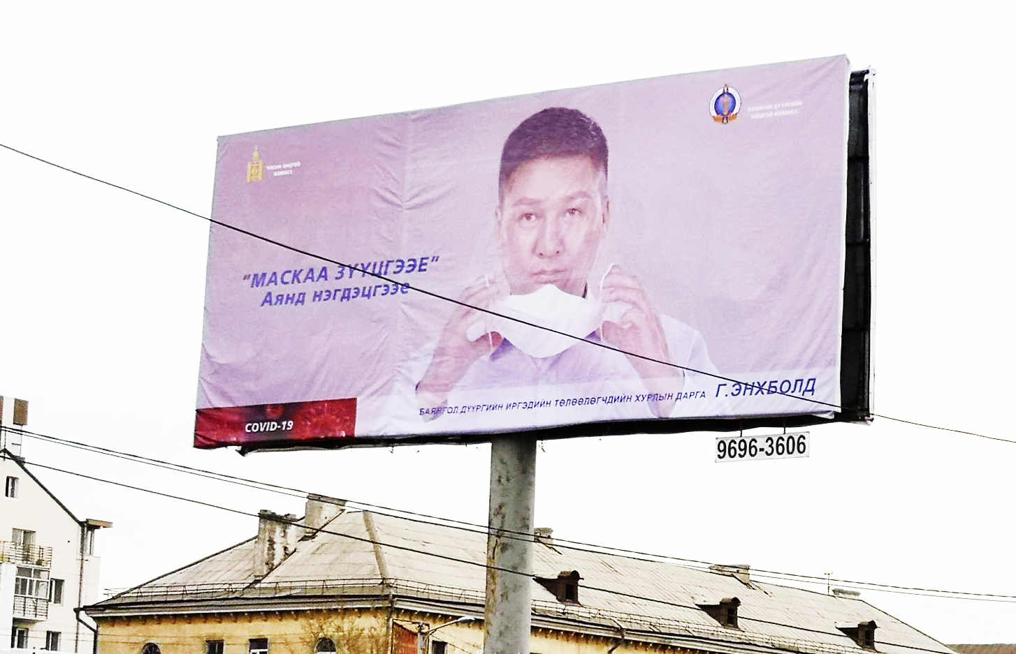 Баянгол дүүргийн Иргэдийн төлөөлөгчдийн хурлын дарга Г.Энхболдын маск барьсан самбар хотын төвд хэд хэд "сүндэрлэжээ".