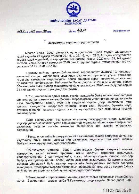 Тэгвэл өмнө гарсан дээрх захирамжийн хуулийн үйлчлэл өчигдөр /2020.04.30/дуусгавар болж байгаатай холбогдуулан Нийслэлийн Засаг дарга С.Амарсайхан А/590 дүгээр захирамж гаргажээ.