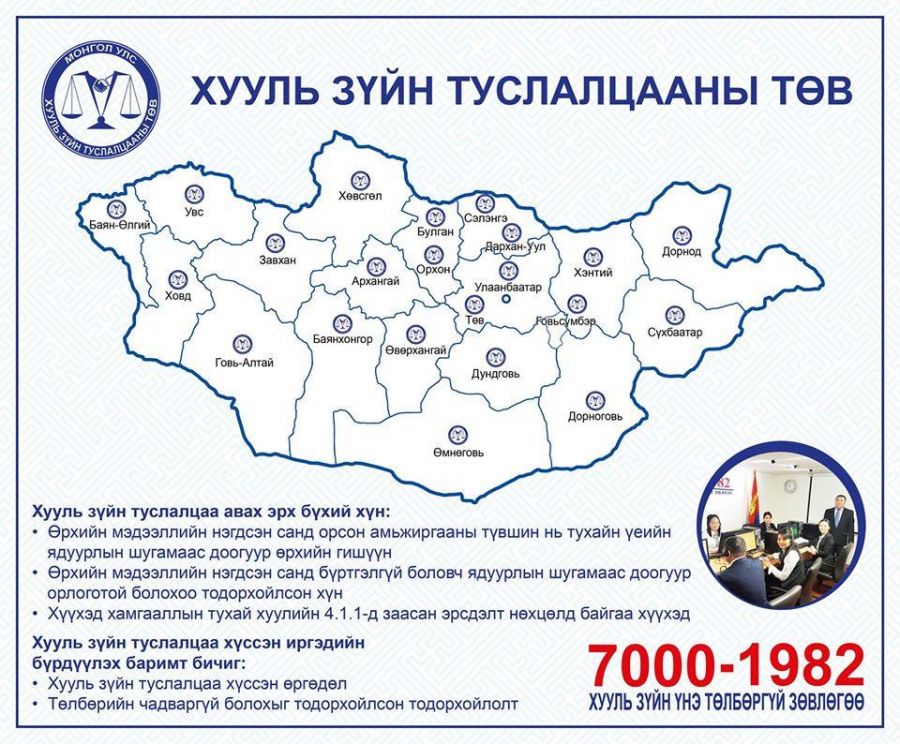 Хууль зүй, дотоод хэргийн яамны харьяа Хууль зүйн туслалцааны төв нь нийслэлийн 8 дүүрэг, 21 аймгийн Засаг даргын Тамгын газарт байрлан 31 салбартай бөгөөд иргэдэд хууль зүйн зөвлөгөө, өмгөөллөөр үнэ төлбөргүй үйлчилж байна.