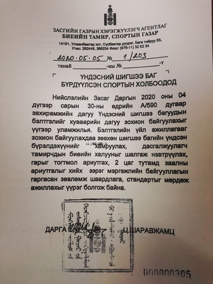 Бэлтгэлийн үйл ажиллагааг зохион байгуулахдаа зөвхөн шигшээ багийн үндсэн бүрэлдэхүүнийг хамруулах, дасгалжуулагч, тамирчдын биеийн халууныг шалгаж нэвтрүүлэх, гарыг тогтмол ариутгах, хоёр цаг тутамд заалны ариутгал хийх зэрэг мэргэжлийн байгууллагын гаргасан зөвлөмж шаардлага, стандартыг мөрдөж ажиллахыг үүрэг болгоно гэж Биеийн тамир, спортын газраас мэдэгдлээ.