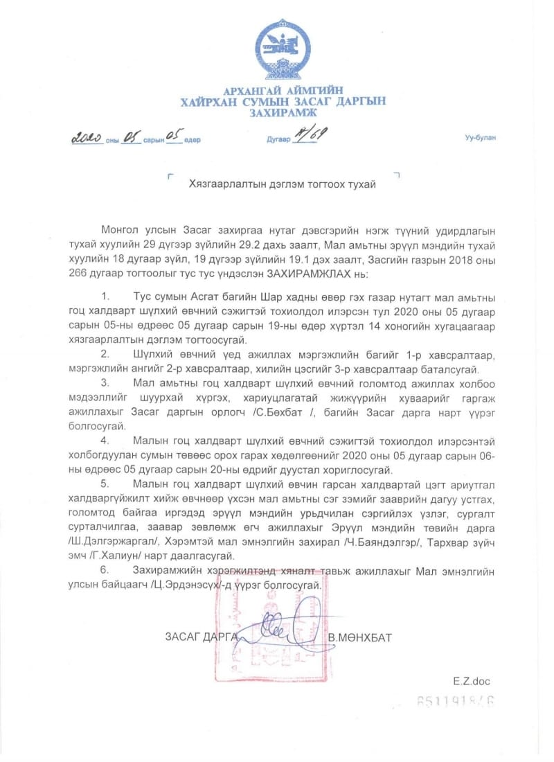 Архангай аймгийн Хайрхан суманд малын гоц халдварт шүлхий өвчний сэжигтэй тохиолдол илэрсэн байна. Иймээс өнөөдрөөс эхлэн 14 хоногийн хугацаанд хязгаарлалтын дэглэм тогтоож, сумаас орох, гарах хөдөлгөөнийг хаажээ.