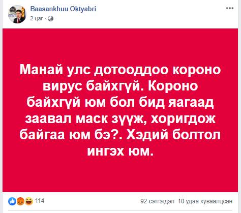 Тэрбээр "Манай улс дотооддоо короно вирус байхгүй. Короно байхгүй юм бол бид яагаад заавал маск зүүж, хоригдож байгаа юм бэ. Хэдий болтол ингэх юм" хэмээн бичжээ.