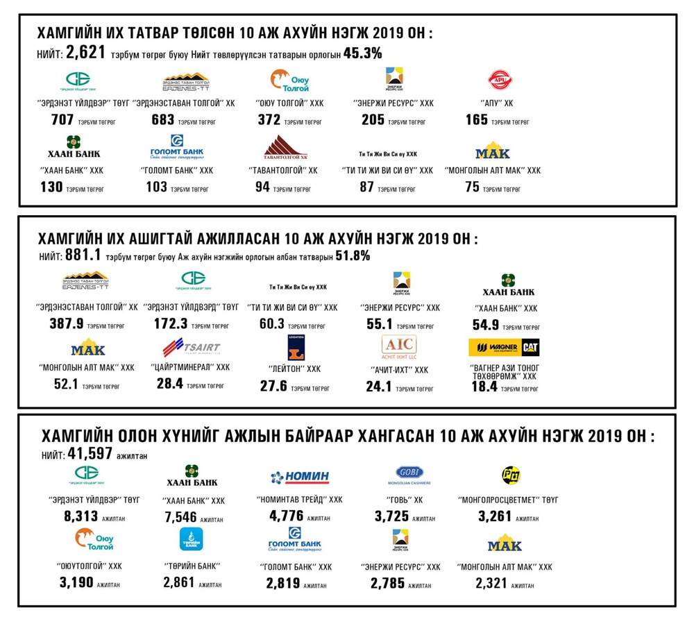 2019 онд хамгийн их татвар төлсөн 10 аж ахуйн нэгжийг Татварын ерөнхий газраас танилцууллаа.