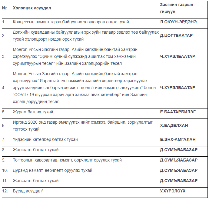 Тухайлбал, Концессын нэмэлт гэрээ байгуулах зөвшөөрөл олгох тухай, Монгол Улсын Засгийн газар, Азийн хөгжлийн банктай хамтран хэрэгжүүлэх “Яаралтай тусламжийн зээлийн хөрөнгөөр хэрэгжүүлэх эрүүл мэндийн салбарын хөгжил төсөл V"-ийн нэмэлт санхүүжилт” болон “COVID-19 шуурхай хариу арга хэмжээ авах хөтөлбөр”-ийн Зээлийн хэлэлцээрүүдийн төсөл, иргэнд 2020 онд газар өмчлүүлэх нийт хэмжээ, байршил, зориулалтыг тогтоох тухай зэрэг асуудлыг хэлэлцэнэ.
