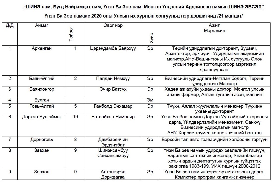 УИХ-ын 2020 оны ээлжит сонгууль ирэх зургаадугаар сарын 24-нд болно. Хуульд заасан хугацаанд буюу энэ сарын 16-ны өдөрт багтаж сонгуульд өрсөлдөх эрхээ авсан нам, эвсэл нэр дэвшигчдээ тодруулах ёстой. Энэ дагуу "Үнэн ба зөв" намынхан нэр дэвшигчдээ тодруулжээ.