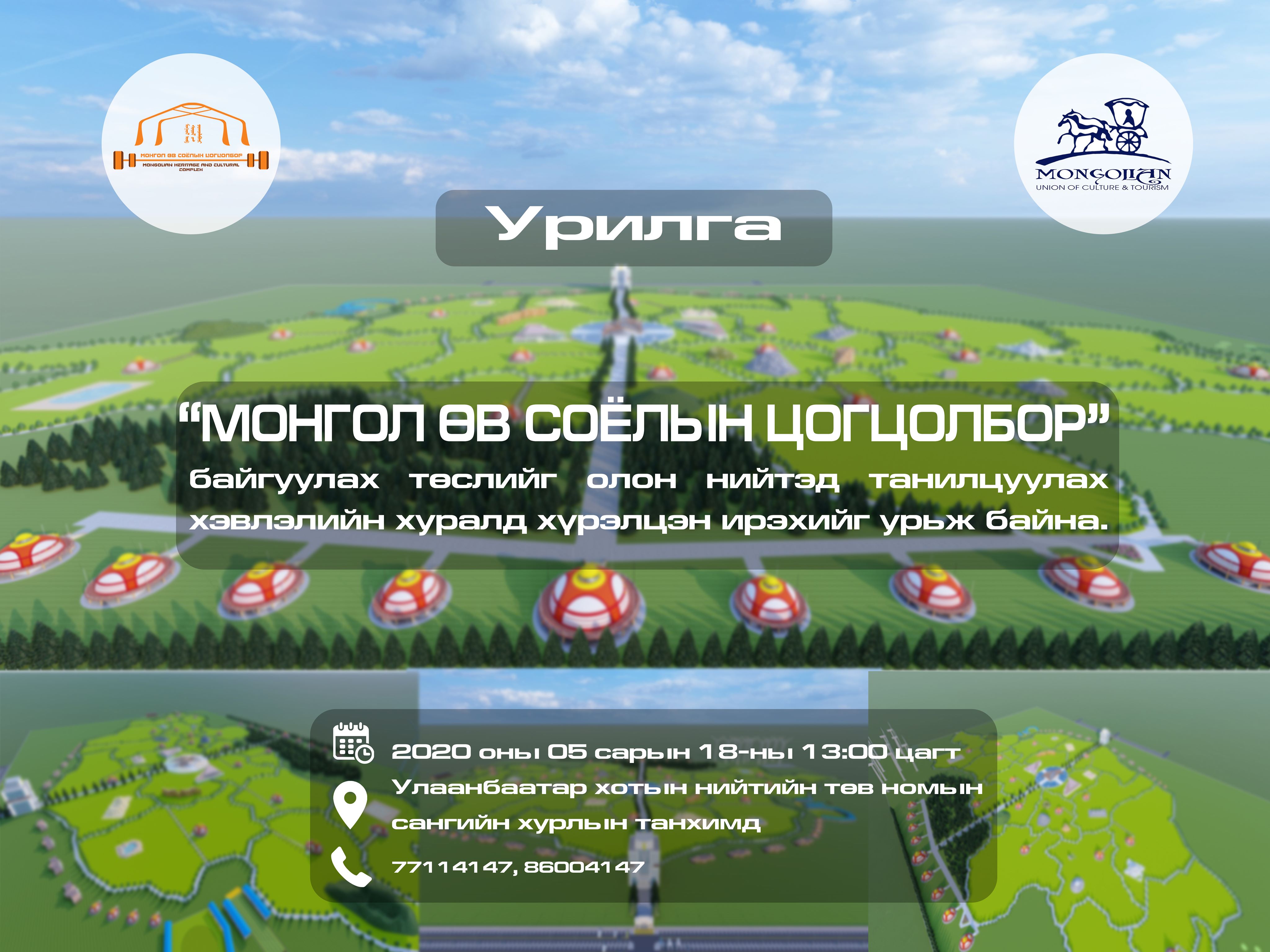 Монгол түмний оюун санаа, ухаан бодлоос ундран оргилж, мянга мянган жилийн турш өвлөгдөн ирсэн аугаа их өв соёлыг 7 ай савын хүрээнд цогцлоон байгуулах, өнөө цагийн Монгол Улсын 21 аймаг, Нийслэлийн 9 дүүргийнхээ соёл, байгаль, түүхийн онцлог агуулгыг нэгэн дор цогцлоон бүтээж хүүхэд, залуус, нийслэлийн иргэд төдийгүй монголын нийт ард түмэн, гадаад, дотоодын жуулчдад дэлгэн үзүүлж, түгээн дэлгэрүүлж, өвлүүлэн үлдээх зорилготой “Монгол өв соёлын цогцолбор” байгуулах төслийг олон нийтэд танилцуулах хэвлэлийн хуралд эрхэм сэтгүүлчид та бүхнийг хүрэлцэн ирэхийг урьж байна.