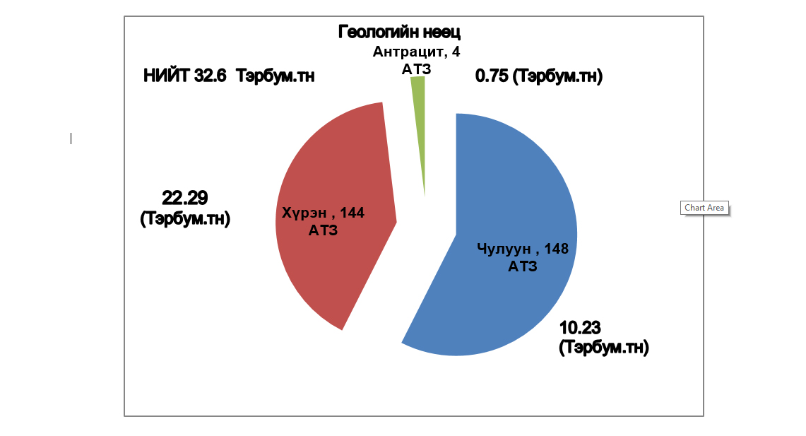Тэгвэл 32.6 тэрбум тонн нүүрсний геологийн нөөцийг ашиглалтын тусгай зөвшөөрөл болон антрацит, чулуун, хүрэн гэсэн гурван төрөлд чанараар нь хуваан харуулбал дараах байдалтай байна.