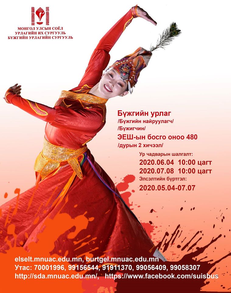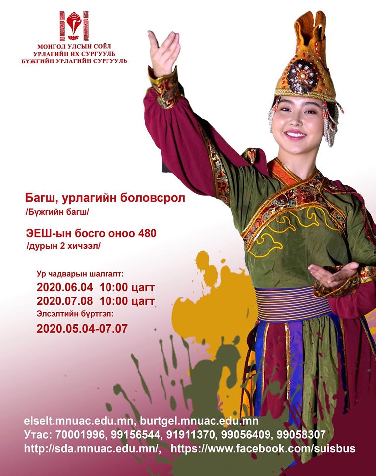 -Манай сургууль Багш, урлагийн боловсрол хөтөлбөрөөр бүжгийн багш бэлтгэдэг. Бүжгийн урлаг хөтөлбөрөөр бүжигчин, бүжиг дэглээч найруулагчийг бэлтгэдэг. Ерөнхийдөө гурван мэргэжлээр элсэлтээ авдаг. Манай хөтөлбөрүүд БМИҮЗ-өөр магадлан итгэмжлэгдсэн гэдгээрээ давуу талтай. Энэ жилийн хувьд цаг үеийн онцлогоос шалтгаалаад элсэлтийнхээ бүртгэлийг цахимаар хийхээр болсон. Элсэгч нь бүрэн дунд болон түүнээс дээш боловсролтой байх, элсэлтийн ерөнхий шалгалтад орсон байх гэсэн ерөнхий шаардлага тавьж байгаа. БСШУСЯ-аас босго оноог 480 болгосон. Тэгэхээр элсэлтийн ерөнхий шалгалтдаа 480 оноо авсан хүүхдүүд манай сургуульд элсэх боломжтой. Мэдээж бид бүжгийн нарийн мэргэжлээр сургалт явуулдаг болохоор бие бялдрын болон ур чадварын шалгалт авах ёстой. Харин онцгой дэглэмийн үед элсэгчид биечлэн шалгалт өгч болохгүй учраас цахимаар шалгалтаа авахаар тусгайлан бэлтгээд байна. Бие бялдрын хөгжил, уян хатан чанар, сонсгол, хөгжмийн мэдрэмж, ой тогтоолт зэрэг нийтлэг үзүүлэлтийг харна. Мөн өөрийн дуртай бүжгээ сонгон бүжиглэж болно. Цахим бүртгэлийг www.elselt.mnuac.edu.mn цахим бүртгэлийн системээр 2020.05.04 - 07.07-ны өдөр хүртэл бүртгэж байна. Ур чадварын шалгалтыг 2020.06.04-ний 10:00 цагаас 2020.07.08-ны 10:00 хүртэл явуулах юм. Мэдээллийн технологи өндөр хөгжсөн болохоор элсэгчид маань цахимаар бүртгүүлэхэд асуудал гарахгүй гэж бодож байна. Харин ч элсэхийг хүссэн залууст сонирхолтой, хялбар аргаар ур чадвараа үзүүлэх боломж гэж үзэн сургуулийн зүгээс ихээхэн ач холбогдол өгч байгаа.