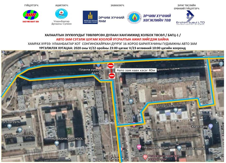 Зам хаан, дулааны шугам татах ажлыг хийж гүйцэтгэх тул ажил гүйцэтгэх хугацаанд жолооч нарыг хөдөлгөөний аюулгүй байдлаа ханган бусад авто замыг сонгон хөдөлгөөнд оролцохыг анхаарууллаа.