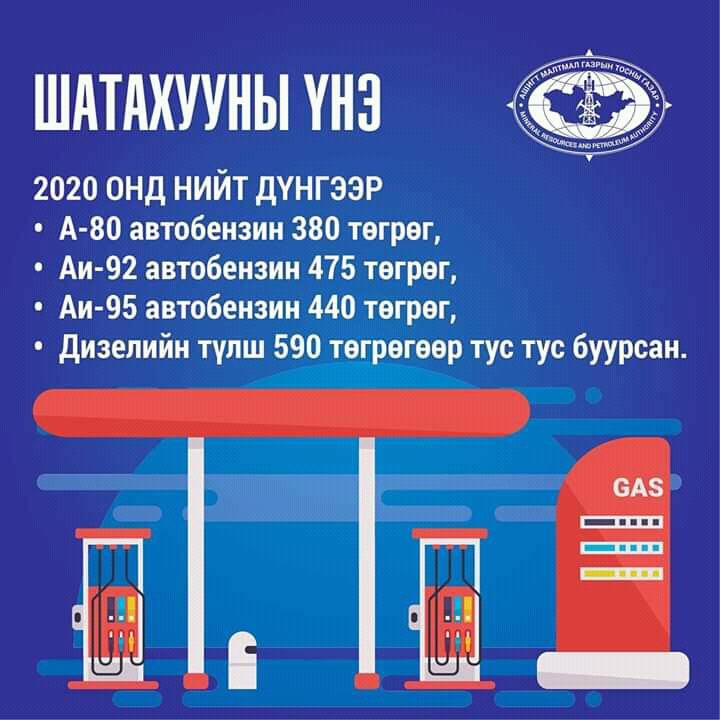 Өнөөдрийн байдлаар шатахууны жижиглэнгийн үнэ Улаанбаатар хотод хэд байгааг хүргэе. А-80 автобензин 1350 төгрөг, Аи-92 автобензин 1360 төгрөг байна. Харин дизелийн түлш 1990, Аи-95 автобензин 1800 төгрөгөөр худалдаалагдаж буй аж.
