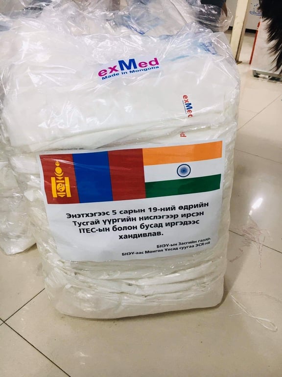 БНЭУ-аас ирсэн иргэд гурав хоногийн хугацаанд хандивын аяныг дотоод цахим группээр дамжуулан зохион байгуулж, аяны хүрээнд цугларсан 4.0 сая гаруй төгрөгөөр үндэсний үйлдвэрлэгч “Exclusive” ХХК-ийн Европын орнууд руу захиалгаар нийлүүлж буй exMed сайн чанарын нэг удаагийн хамгаалах хувцаснаас 240 ширхгийг худалдан авч, тэнцүү хуваан Улсын Онцгой комисс болон Энэтхэгийн Элчин сайдын яаманд тус бүр 120 ширхгийг хүлээлгэн өгч байгаа ажээ.