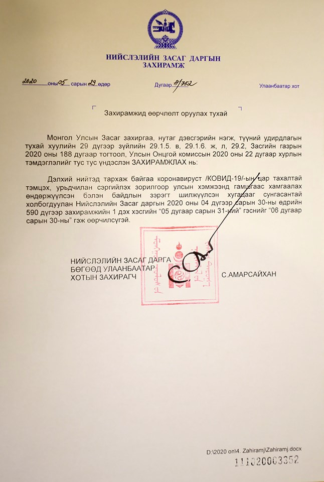 Дэлхий нийтэд тархаад буй “Ковид-19” цар тахлаас урьдчилан сэргийлэх арга хэмжээнүүдийг чангатгах, хөл хориог үргэлжлүүлэх шийдвэр Улсын онцгой комиссын өргөтгөсөн хуралдаанаар гарч Засгийн газрын хуралдаанаар баталгаажуулсан билээ. Улсын онцгой комиссын өргөтгөсөн хуралдаанаас гаргасан шийдвэрийн дагуу “Иргэдийн эрүүл мэндийг хамгаалах талаар авч хэрэгжүүлж байгаа ажлыг эрчимжүүлэх тухай” нийслэлийн Засаг даргын А/223 дугаар захирамжийн үйлчлэх хугацааг ирэх зургаадугаар сарын 30-ны өдрийг хүртэл сунгаж байгаатай холбогдуулан Нийслэлийн Засаг даргын “Захирамжид өөрчлөлт оруулах тухай” А/752 дугаар тоот захирамж өнөөдөр гарлаа.
