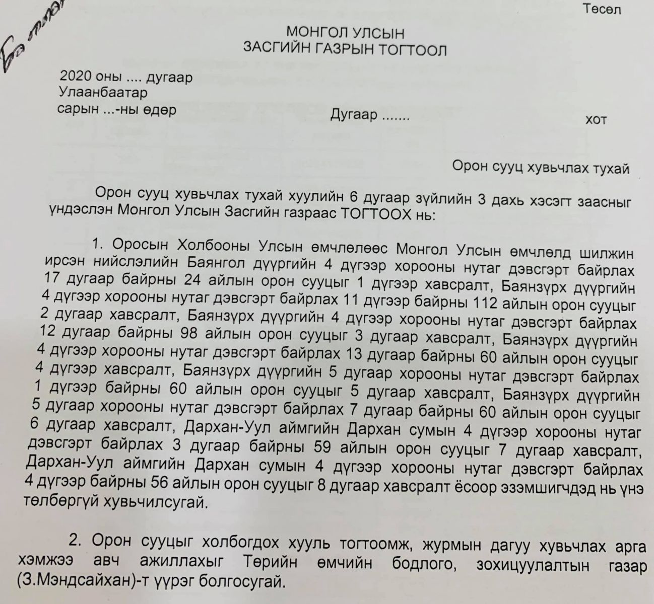 Тэгвэл дөнгөж сая ОХУ-ын өмчлөлд байсан найман байрыг Монгол Улсын өмчлөлд үнэ төлбөргүй шилжүүлж авлаа. Тодруулбал, 549 өрх 22 жил түрээсээр амьдарч байсныг оршин суугчдад нь хувьчилах бэлтгэл ажлыг хийсэн бөгөөд 1998 оноос хойш тасралтгүй ярьж байсан энэ асуудал Ерөнхий сайд У.Хүрэлсүхийн ОХУ-д хийсэн айлчлалаар шийдэгдсэн билээ.