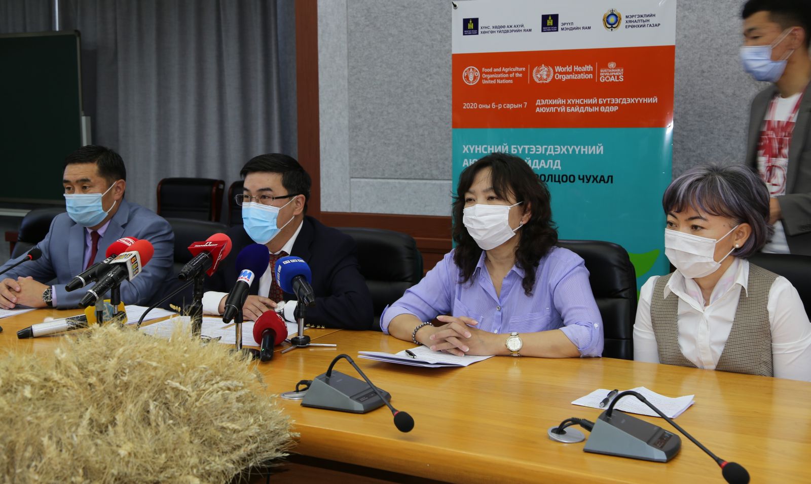 Монгол Улс 2020 онд “Хүнсний бүтээгдэхүүний аюулгүй байдлыг хангахад хүн бүрийн оролцоо” уриа дор ирэх Ням гарагт тэмдэглэн өнгөрүүлэх бөгөөд ХХААХҮЯ-ны ХҮХБЗГ-ын дарга Т.Гантогтох, ЭМЯ-ны НЭМГ-ын мэргэжилтэн Б.Бямбатогтох, МХЕГ-ын Хүнсний аюулгүй байдал, хөдөө аж ахуйн хяналтын газрын дарга Т.Балжинням, НҮБ-ын ХХААБ-ын шадар суурин төлөөлөгч Г.Нямжаргал нар өнөөдөр хэвлэлийн бага хурлыг зохион байгуулав.