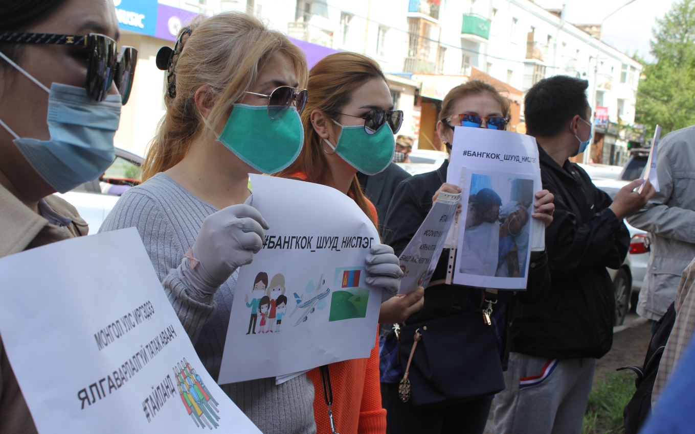 Онцгой байдлын ерөнхий газрын зүгээс дотогш нэвтрүүлэхгүй, ямар нэгэн мэдээлэл, тайлбар өгөх боломжгүй гэлээ.  Одоогийн байдлаар Япон улсаас 1460 гаруй, БНСУ-д 3000 орчим иргэд буцах хүсэлтээ өгсөн бол нийт 46 улсад байгаа 10836 иргэн эх орондоо ирэх хүсэлтээ ирүүлээд байгаа аж. Тэгвэл Улсын Онцгой комиссоос Зүүн азийн оронд гацсан хүмүүсийг Токио, Сөүлийн нислэгээр авчирна гэдэг шийдвэр гарсан.  Жагсаж буй иргэд “Тайланд төдийгүй Зүүн Азийн орнуудад гацсан иргэдийг татаж, Бангкок руу шууд нислэг хийж өгөхийг хүсэж байна. Зүүн өмнөд Азийн орнуудаас ирэх иргэдийг Сөүл, Токиогоор дамжуулан авна гэж төлөвлөж байгаа ч Япон, Өмнөд Солонгосоос 500 орчим иргэнийг татсаны дараа нислэг хийгдэхээр цаг их алдана” гэж учирлаж байлаа. Ар гэрийнхний төлөөлөл Б.Ганаа “Манай ах У нь 51 настай, элэгний хавдартай хүн. Тайландад нэгдүгээр сард очоод 60 гаруй сая төгрөгөөр химийн тариа хийлгэсэн. Нэг л сарын хугацаагаар явсан тул хамаг мөнгө нь дуусаад  бид машиныг нь  барьцаанд тавьж 20 гаруй сая төгрөг явуулсан. Одоо орон байргүй, мөнгө төгрөггүй айлын нэг буланд амь хоргодож байгаа учир сэтгэл санаа нь хямралтай, хэцүүхэн байна. Төр засаг 160 иргэнээ шууд нислэгээр нэн даруй авчрахгүй бол эрүүл мэнд, эдийн засгаараа маш их хохирч байна” гэлээ. Олон нийтийн сүлжээгээр гадаадаас ирсэн иргэдийг халдвар тээж ирлээ гэх шүүмжлэл маш их давлагаалж байгаа энэ үед Тайландад хашигдсан иргэд халдваргүй гэдгээ баталж, эртхэн иргэдээ татан авахгүй бол халдвар авах нөхцөл байдал үүсэж болзошгүй байгааг анхааруулж байв.