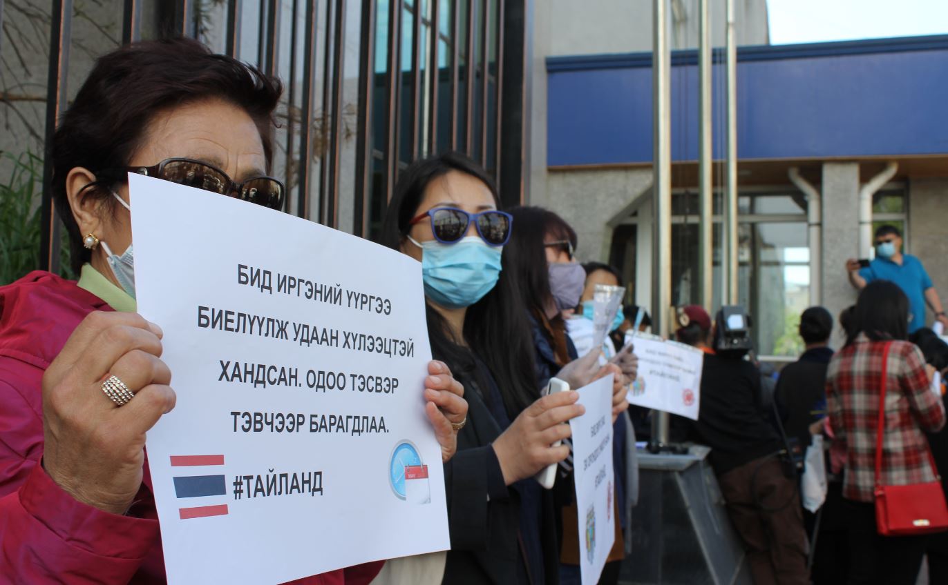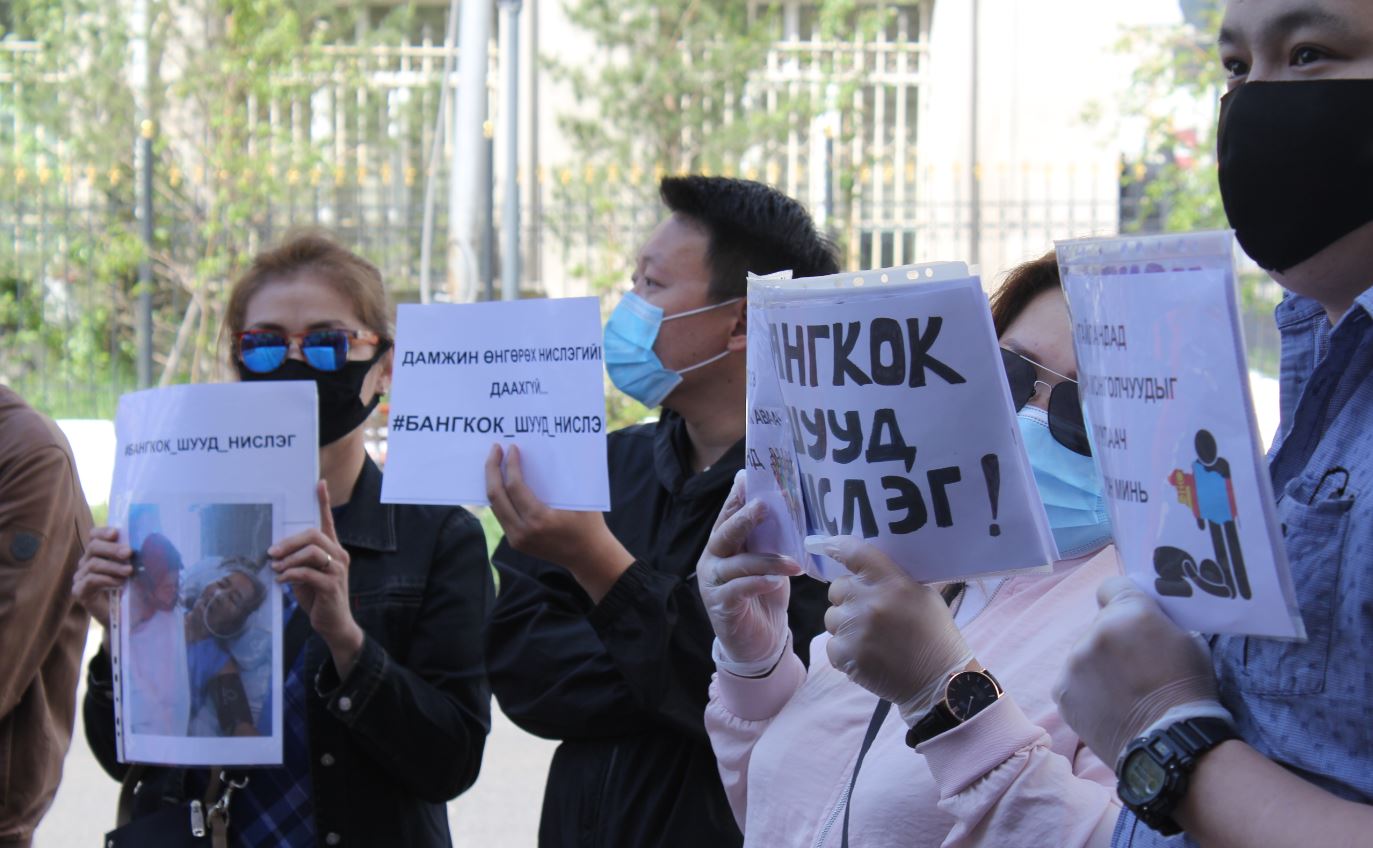 Тайланд улсад гацсан монголчуудын ар гэрийнхэн өчигдөр Онцгой байдлын ерөнхий газрын гадна талбайд жагслаа. Цугларсан иргэд Тайландад гацсан иргэдээ татан авах гарын үсэг зурж, Онцгой байдлын ерөнхий газарт шаардлага хүргүүлэхээ мэдэгдсэн юм. Газар дээрээс нь очиж сурвалжлахад Тайландад гацсан 160 гаруй иргэний ар гэрийнхний төлөөлөл цугларч, “Шууд нислэг хийх шаардлагатай байна. “Тайланд улс КОВИД-19-ийг бүрэн хяналтдаа авсан. Бид аюулгүй”, “Гадаадад гацсан монголчуудыг эх оронд нь оруулаач” гэх зэрэг уриа лоозон бүхий бичиг барьжээ