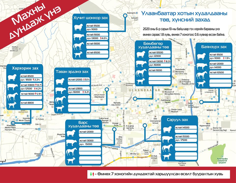 Улаанбаатар хотын зарим худалдааны төв, хүнсний захад махны үнэ ямар байгааг инфографикаар хүргэж байна. “Хүчит шонхор” зах дээр үхрийн цул мах кг нь 13 000, хонины цул мах кг нь 11 000 төгрөг байна.