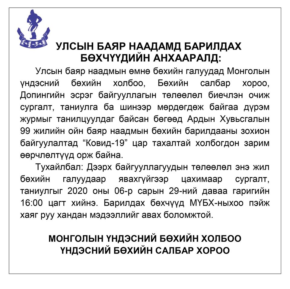 Ардын Хувьсгалын 99 жилийн ойн баяр наадмын бөхийн барилдааныг зохион байгуулах Үндэсний бөхийн салбар хорооноос өгсөн чиглэлийн дагуу Улсын баяр наадамд барилдах бөхчүүдийг өнөөдрөөс (2020.06.26) цахимаар бүртгэж эхэллээ.