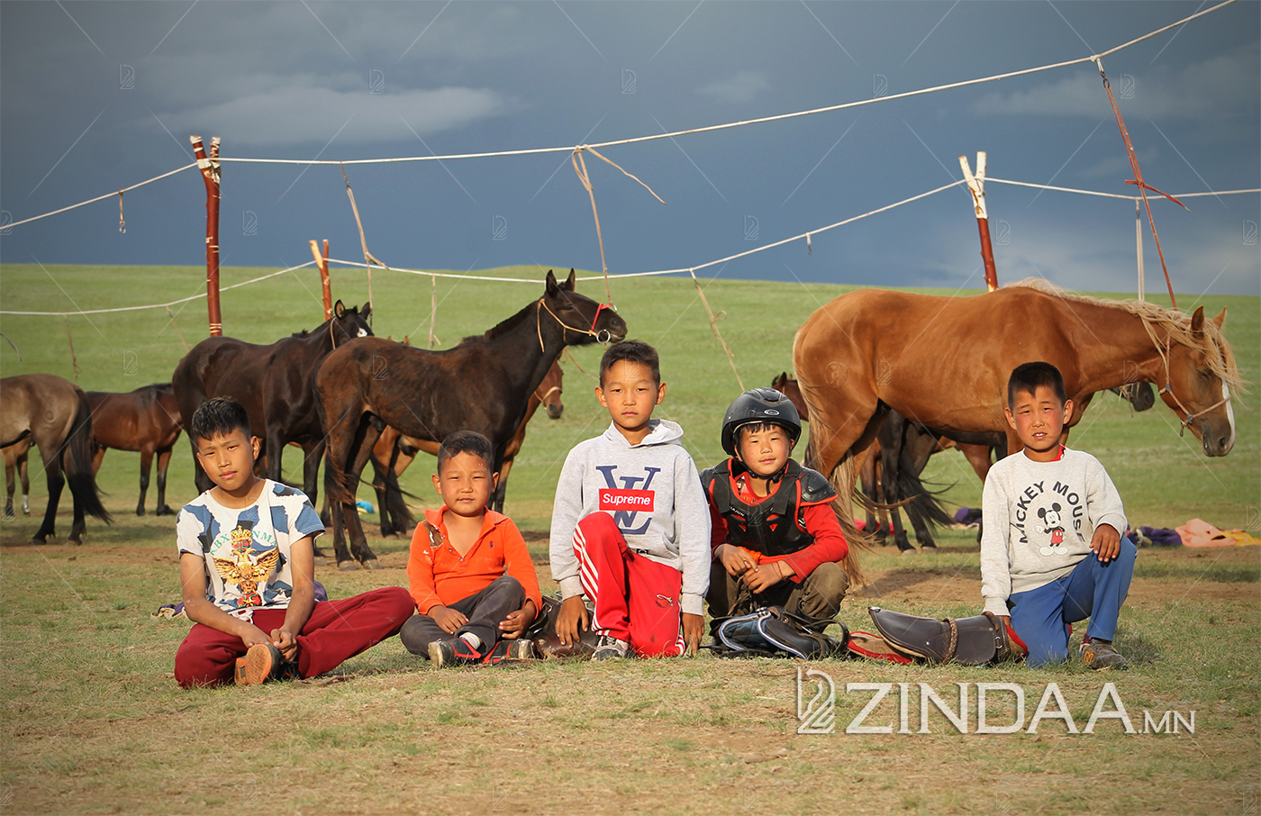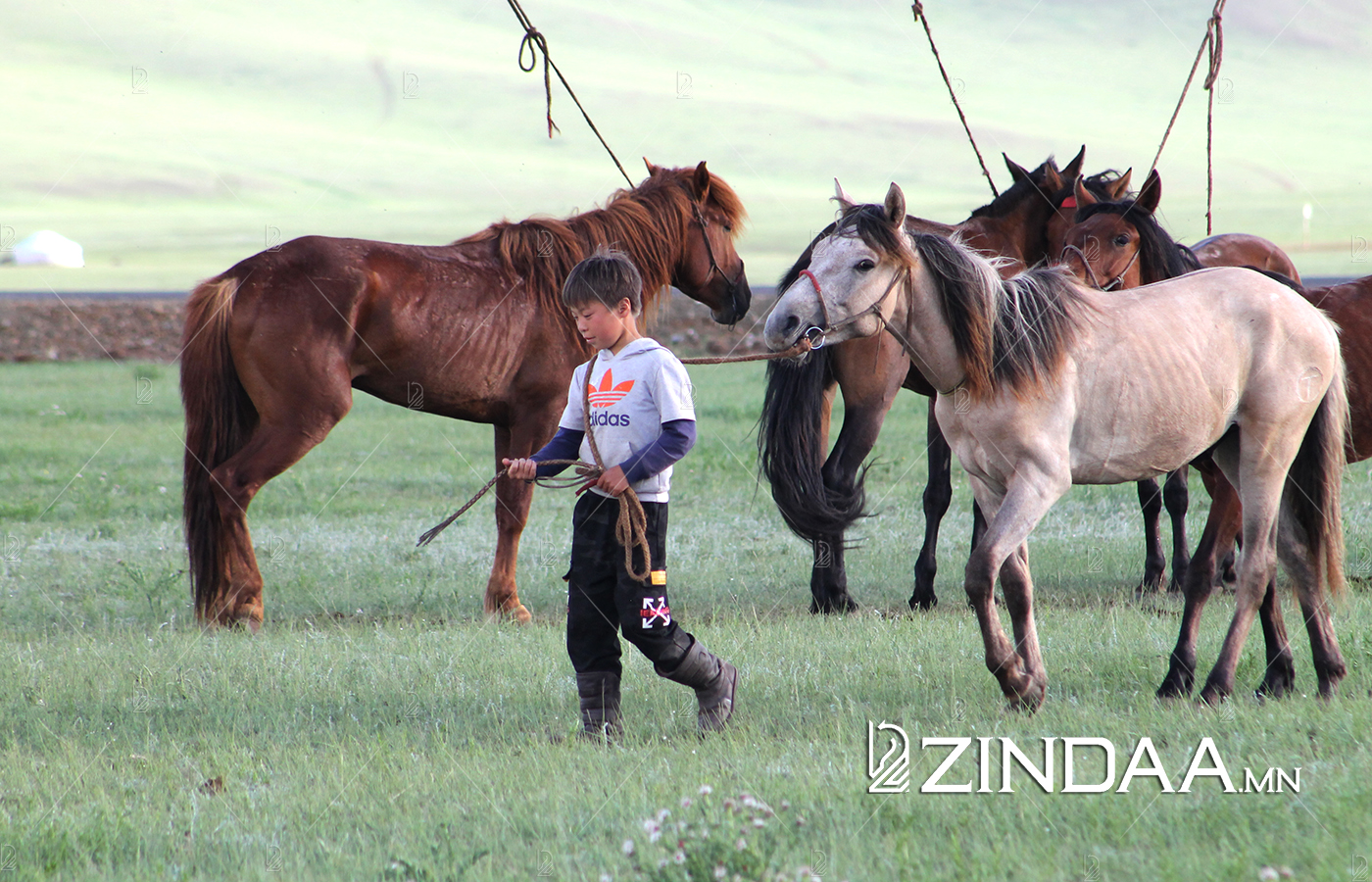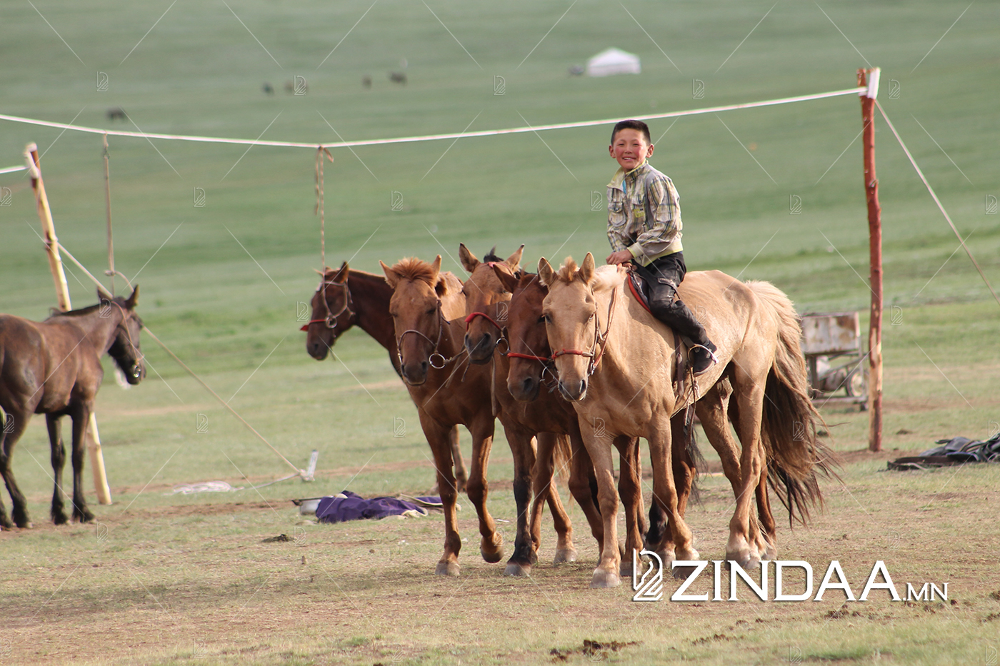 Халзтай том гэрээ газрын дээд талд барьж, түүнээсээ зээглэн хоёр ч жижиг гэр барьсан бөгөөд монгол банхар, тайга үүлдрийн хоёр нохой хуцан гүйх нь сүрдмээр. Эднийх зургаан насны 30 орчим морьд уяжээ. Хурдан мориных нь унаач хүүхэд нохойгоо хорин биднийг буулгаж монгол банхарыг зааж энэ бол сүрээрээ айлгадаг, харин энэ нь хурдаараа айлгадаг хэмээн тайга нохойг заав. Яг л энэ насан дээрээ монгол хөвгүүд, охид шөнө бүр наадмын түрүү зүүдлэж, өдөр бүр морьдоо хайрлаж өсдөг. Уяа нь эвлэж яваа морьдыг харж бахдах, том нохдоос сүрдэхийн завсарт байтал Б.Дашдорж уяач ирлээ. Амар мэнд мэдэлцэн газрын гарц, морьдын уяа гэх ойр зуурын юм ярилцахад л морио гардан уядаг жинхэнэ уяач гэдэг нь мэдэгдэнэ. Том машин хөлөглөж, хаа нэг морьдоо эргэдэг “алдартууд” бол андашгүй л байдаг.