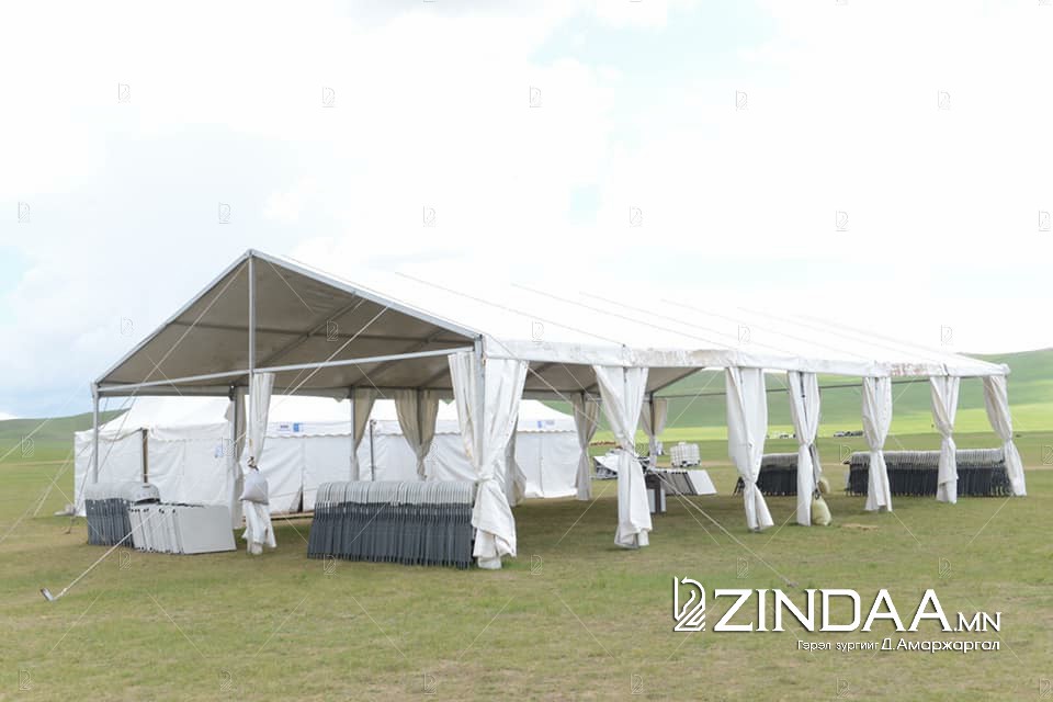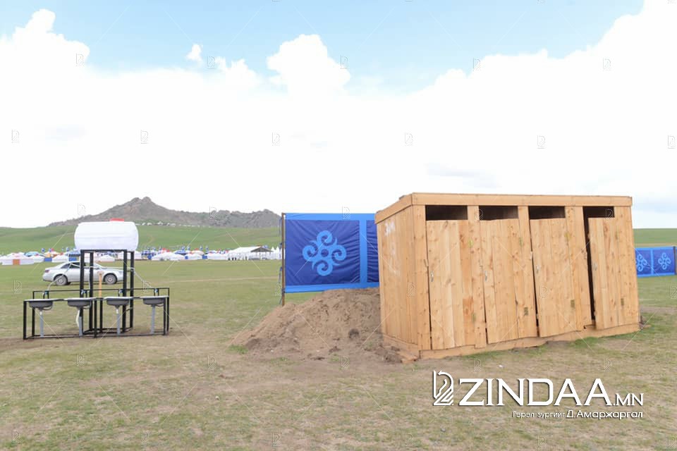 Хэдхэн хоногийн өмнө ХЦДБЧ-ын найрал хөгжимчид, БЦДБЧ-ын уран бүтээлчид, ҮУИТ-ийн бүжигчид ирээд явсан нь гэрүүдийн хаалган дээр наасан хаяг гэрчилнэ. Тэд наадмын нээлтийн урлаг соёлын хөтөлбөрийн зураг авалтаа ийнхүү урьдчилан бичээд амжжээ. Тайзны зүүн урд жигүүрт гал тогоо бүхий цагаан асар ширээ сандал бэлтгэсэн нь наадамчид, сэтгүүлчдийн хоол ундаа идэх хэсэг бололтой. Түүнээс урагш 500 метр зайд эрэгтэй эмэгтэй модон жорлон, дөрвөн тосгууртай гар угаагуур байрлуулжээ. Наадам болох хэсэгт тог цахилгаан татаагүй мотороор ажиллахаар зэхсэн байв