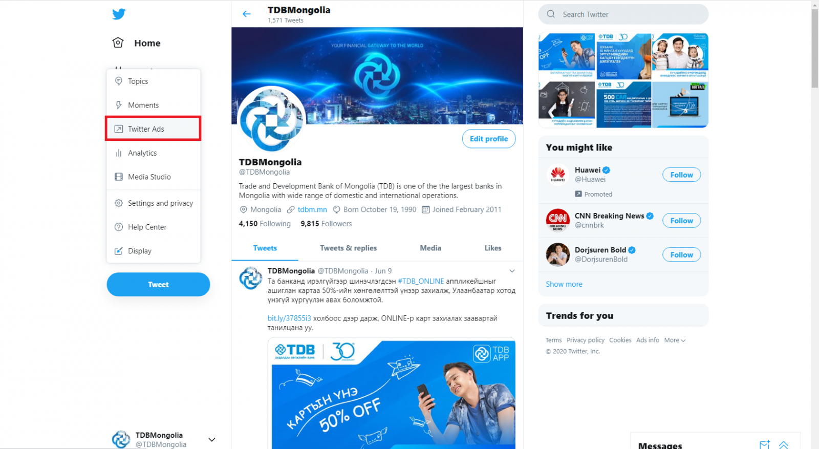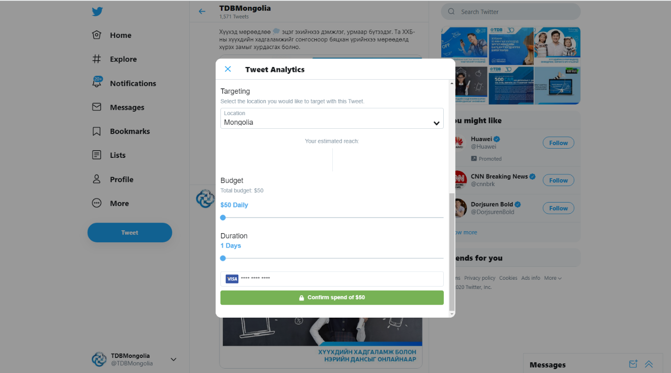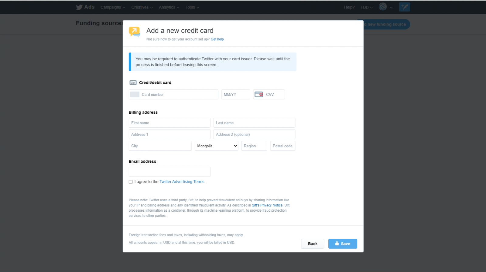 1. Доорх зурагт харуулсны дагуу Twitter Ads цонх дээр дарснаар Таны төлбөрийн картын мэдээллээ оруулах цонх гарч ирнэ.