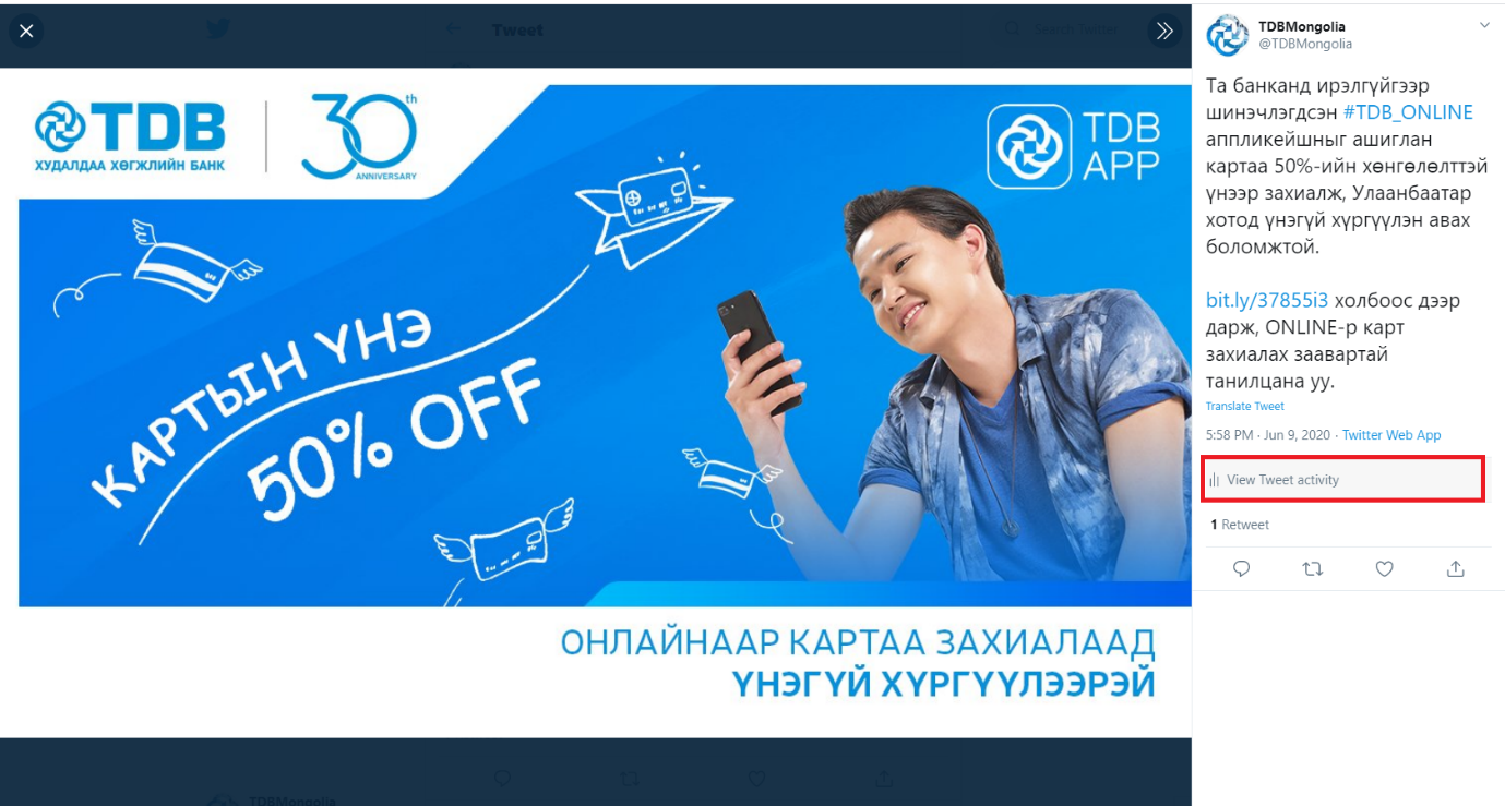 1. Картынхаа мэдээллийг үнэн зөв оруулан, картаа бүртгүүлснийхээ дараа сурталчлах шаардлагатай Tweet дээрээ дарж, “View Tweet Activity” сонголтыг сонгоно.
