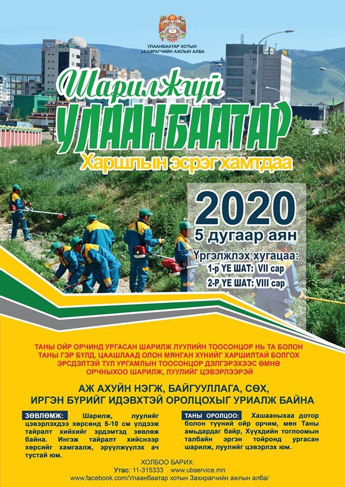 Улаанбаатар хотын Захираргчийн ажлын албанаас "Шарилжгүй Улаанбаатар V" аяныг зарлалаа. Аянд иргэн, Аж ахуй нэгж байгууллагууд, СӨХ бүр идэвхтэй оролцон, шарилж, луулийг цэвэрлэн, олон мянган хүнийг харшилтай болох эрсдэлээс сэргийлэхийг уриалж байна.