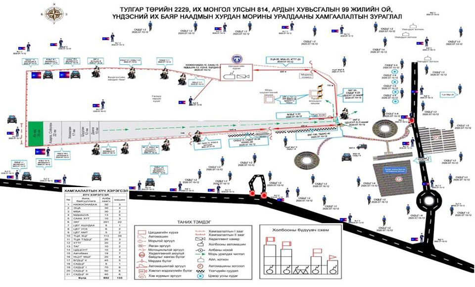 ЦЕГ-ын Нийтийн хэв журам хамгаалах, олон нийтийн аюулгүй байдлыг хангах албаны дарга, Цагдаагийн хурандаа Ж.Амгалан “Цагдаагийн байгууллага улсын их баяр наадам болбол хэрхэн ажиллах тухай судалгаа гаргаж, Улсын Онцгой комисст танилцуулсан. Хэрэв Хүй долоо худагт нэгдсэн байдлаар тэмдэглэвэл 800 бөх, хурдан морь, уяач, хүүхдүүд гээд олон хүн бөөгнөрөх учраас тус тусад нь зохион байгуулахаар болсон. Түүнчлэн цэнгэлдэх хүрээлэнд болбол хотын төвд учраас халдвар дэгдэх аюултай гэж үзэн XIII зуун цогцолбор, Хүй долоо худагт болохоор болсон. XIII зуунд Үндэсний бөхийн барилдаан, сур, шагайн харваан талбай бэлэн болсон. Цогцолборт зөвхөн уралдаанд оролцох хүн л орно. Хүй долоон худагт бэлдсэн 2000 орчим автомашины зогсоолд харваач, бөхчүүд машинаа байршуулна. Маргааш хурдан морины салбар комисс хуралдаж, дахин нарийн шийдвэр гаргана. Хурдан морины уралдааны үед Улаанбаатар хотоос гарах хөдөлгөөнийг хаана. Орж байгаа хөдөлгөөн нээлттэй байна” гэдгийг мэдээллийн үеэр онцолж хэлэв.